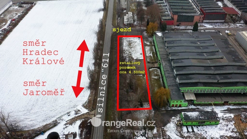 možno rozšířit o další pozemkovou retailovou plochu: cca 4.500m2, s přímým sjezdem z komunikace č. II/611 (ve směru Hradec Králové – Jaroměř, paralelně s D11)