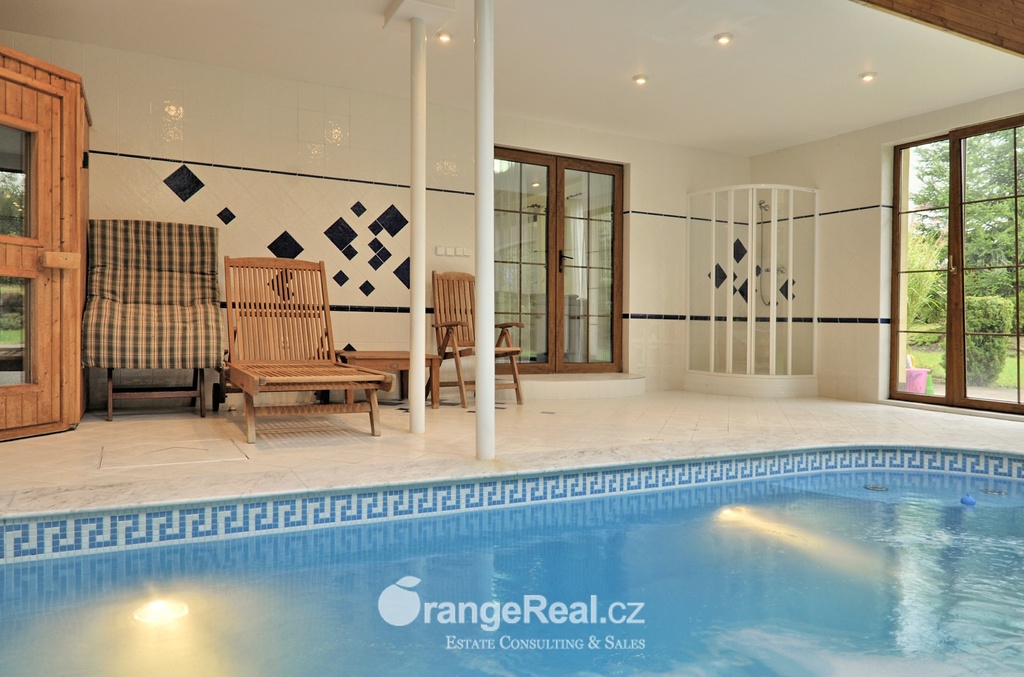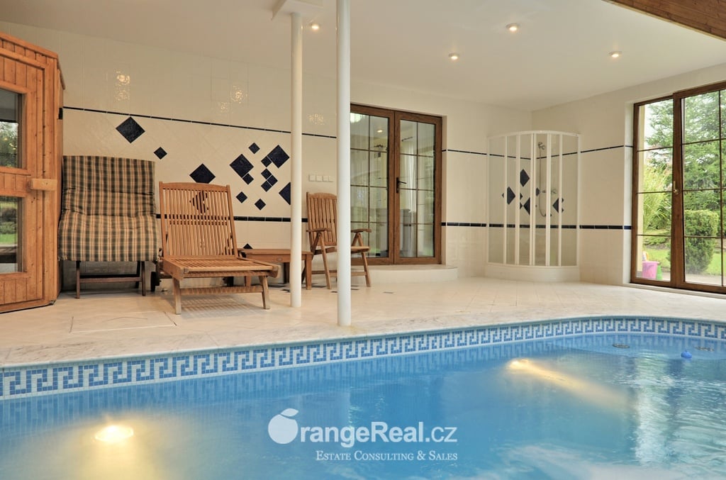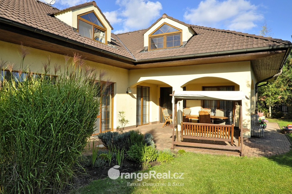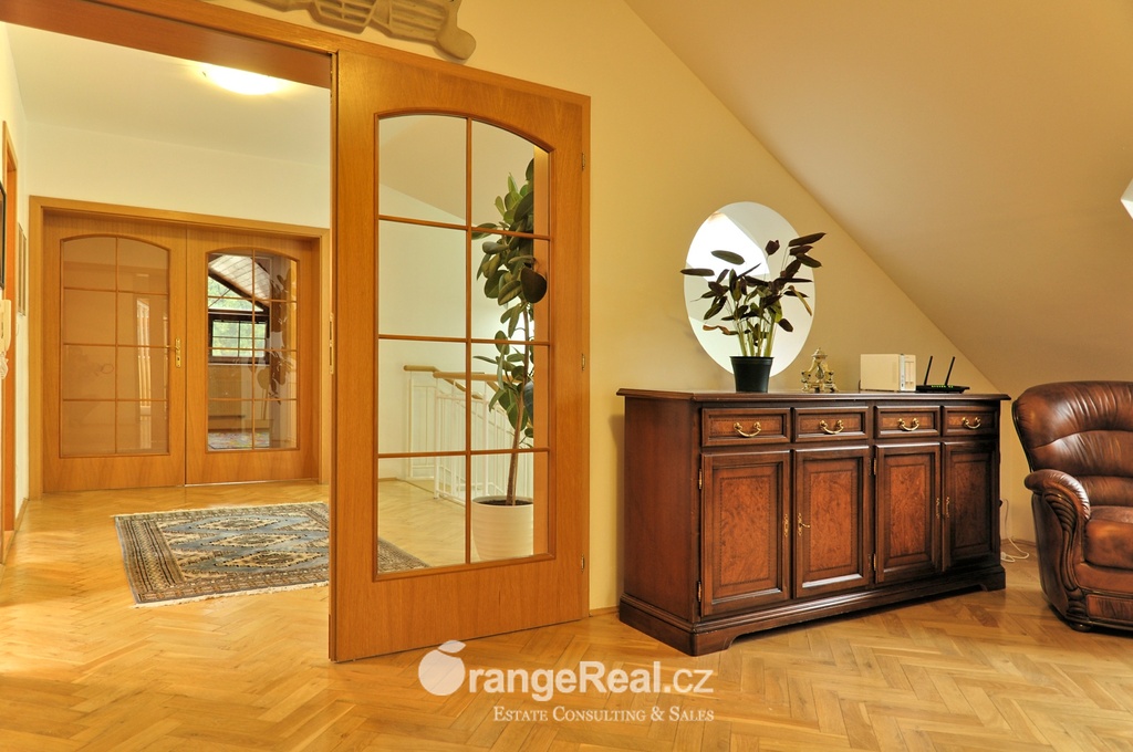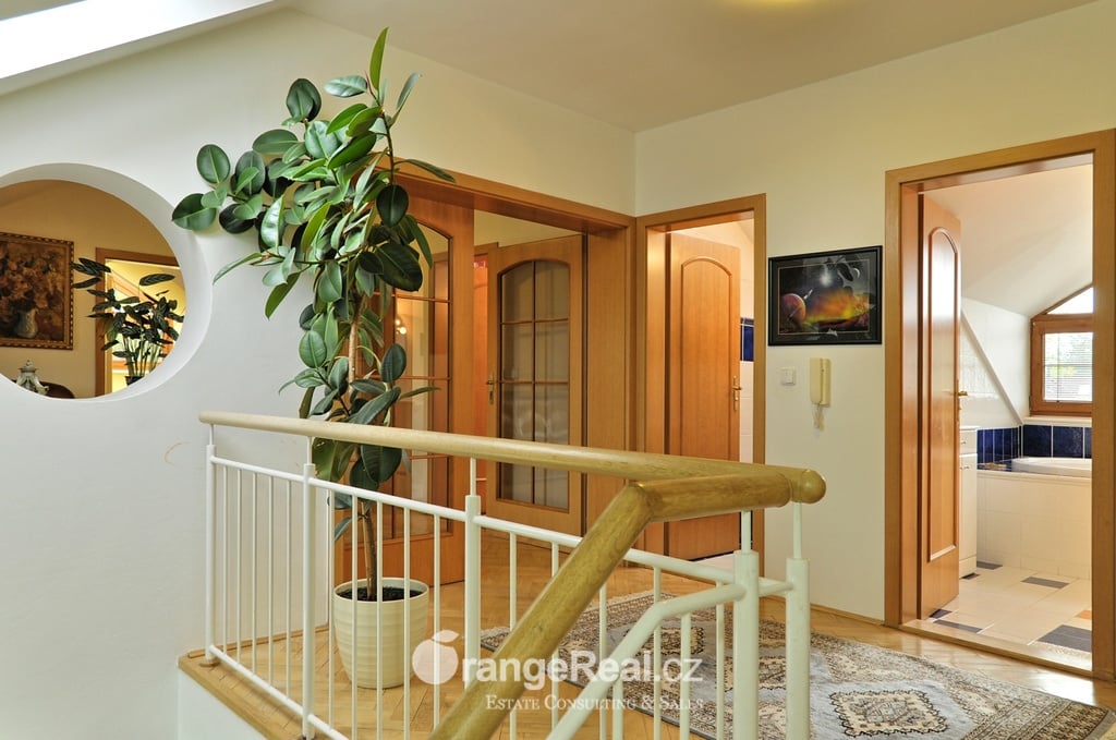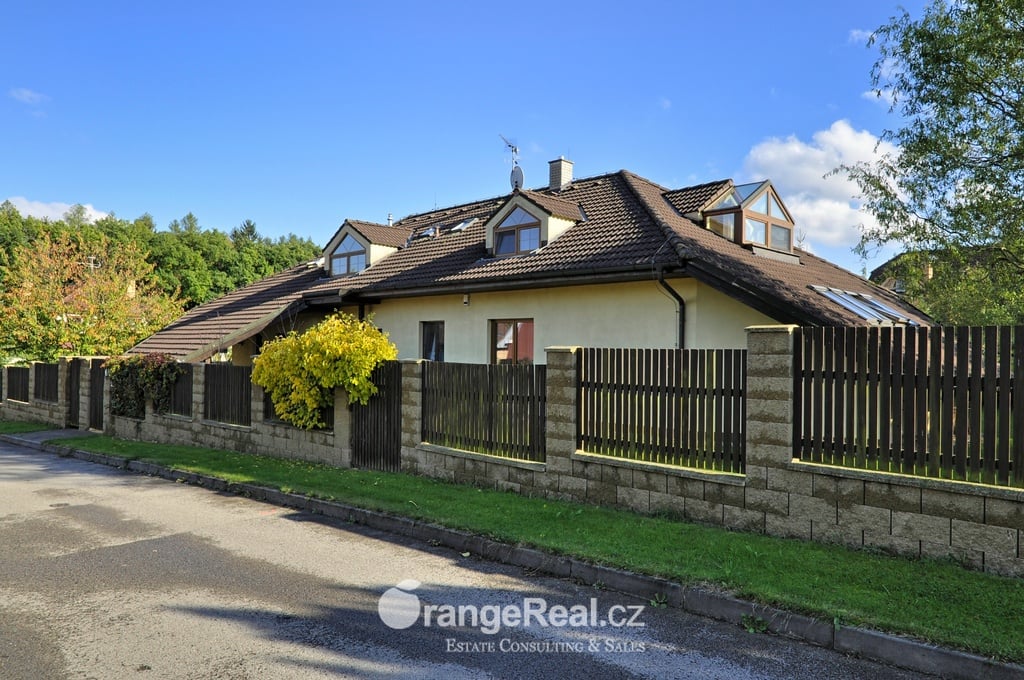 Výhradně nabízíme k prodeji krásný rodinný dům v lokalitě Jesenice - Horní Jirčany. Dispozičně 8+1, o užitné ploše 334m2 + bazén 32m2 a terasa 44m2. Dům se nachází na pozemku o výměře 1.111m2, v bonitní a vyhledávané lokalitě. Dům sestává v I. NP ze zádveří /dveřmi propojené s garáží/ navazující na prostornou halu, z které je v pravém křídle domu přístup do kuchyně s jídelním zázemím a obývacího pokoje se vstupem do realxační bazénové místnosti /bazén, sauna, sprcha/, prosklenými dveřmi a okny opticky propojené se zahradou. Bazén je celoročně uživatelný, vyhřívaný. Obývacímu prostoru dominuje krb s krbovou vložkou, z místnosti lze vstoupit na prostorově velkorysou terasu s krytou částí. Ze vstupní haly lze dále projít do levého křídla domu, kde nalezneme koupelnu s toaletou, ložnici, šatnu a pracovnu. Po točitém schodišti se vystoupá do II. NP, které sestává z haly, šatny, komory, dalších čtyřech obytných místností, technického zázemí domu, koupelny a samostatné toalety. Vytápění domu, bazénu a ohřev TUV zajišťují 2 plynové kondenzační kotle, v I. NP podlahové topení, ve II. NP radiátory. Dům se nachází v přírodní lokalitě, ovšem v blízkosti hlavního města Prahy. Doprava do ZŠ školní bus zajištěný obcí. 8min Canadian scholl, MŠ i anglická, ZUŠ, golfové hřiště. Obchodní možnosti v místě, dále OC Průhonice, Chodov. Doplňující informace u obchodníka společnosti. Doporučujeme navštívit virtuální prohlídku na web stránkách naší společnosti.