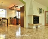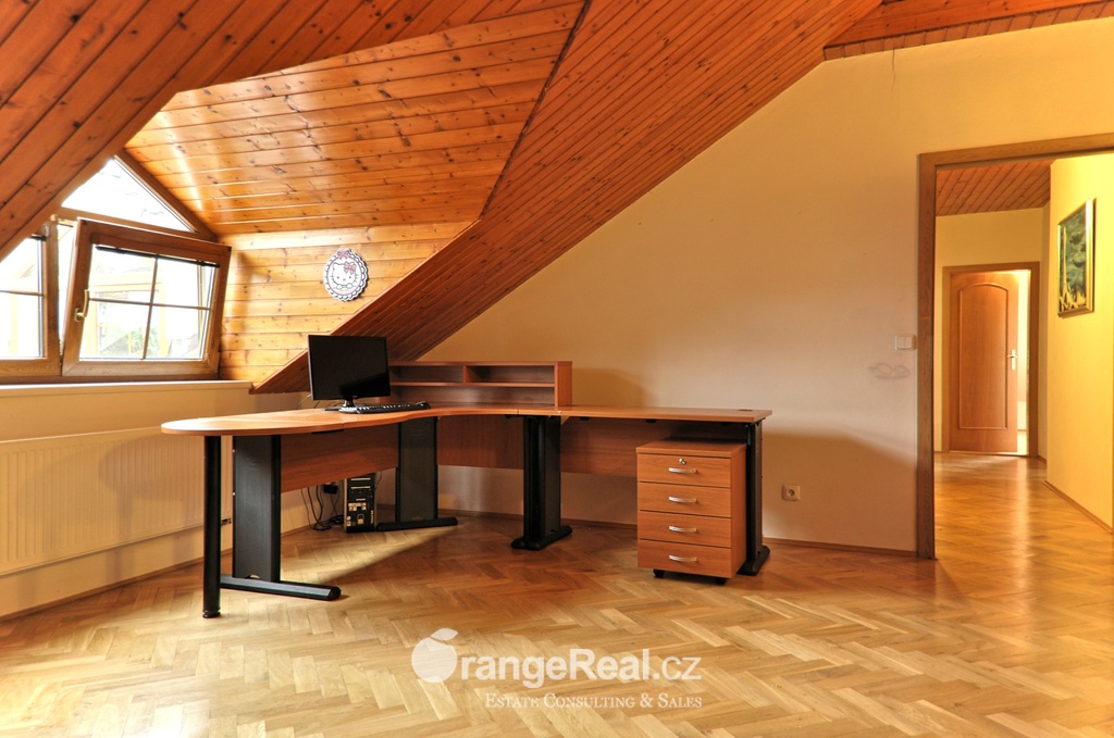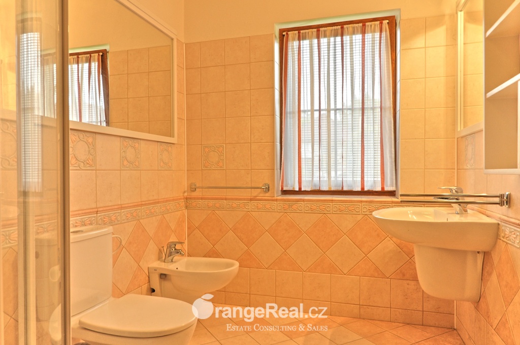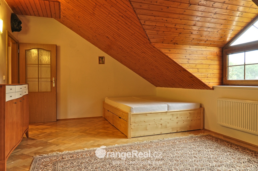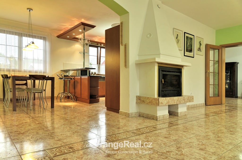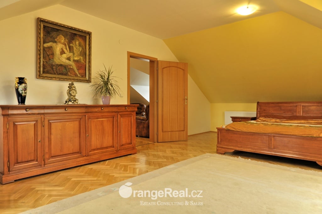 Výhradně nabízíme k prodeji krásný rodinný dům v lokalitě Jesenice - Horní Jirčany. Dispozičně 8+1, o užitné ploše 334m2 + bazén 32m2 a terasa 44m2. Dům se nachází na pozemku o výměře 1.111m2, v bonitní a vyhledávané lokalitě. Dům sestává v I. NP ze zádveří /dveřmi propojené s garáží/ navazující na prostornou halu, z které je v pravém křídle domu přístup do kuchyně s jídelním zázemím a obývacího pokoje se vstupem do realxační bazénové místnosti /bazén, sauna, sprcha/, prosklenými dveřmi a okny opticky propojené se zahradou. Bazén je celoročně uživatelný, vyhřívaný. Obývacímu prostoru dominuje krb s krbovou vložkou, z místnosti lze vstoupit na prostorově velkorysou terasu s krytou částí. Ze vstupní haly lze dále projít do levého křídla domu, kde nalezneme koupelnu s toaletou, ložnici, šatnu a pracovnu. Po točitém schodišti se vystoupá do II. NP, které sestává z haly, šatny, komory, dalších čtyřech obytných místností, technického zázemí domu, koupelny a samostatné toalety. Vytápění domu, bazénu a ohřev TUV zajišťují 2 plynové kondenzační kotle, v I. NP podlahové topení, ve II. NP radiátory. Dům se nachází v přírodní lokalitě, ovšem v blízkosti hlavního města Prahy. Doprava do ZŠ školní bus zajištěný obcí. 8min Canadian scholl, MŠ i anglická, ZUŠ, golfové hřiště. Obchodní možnosti v místě, dále OC Průhonice, Chodov. Doplňující informace u obchodníka společnosti. Doporučujeme navštívit virtuální prohlídku na web stránkách naší společnosti.