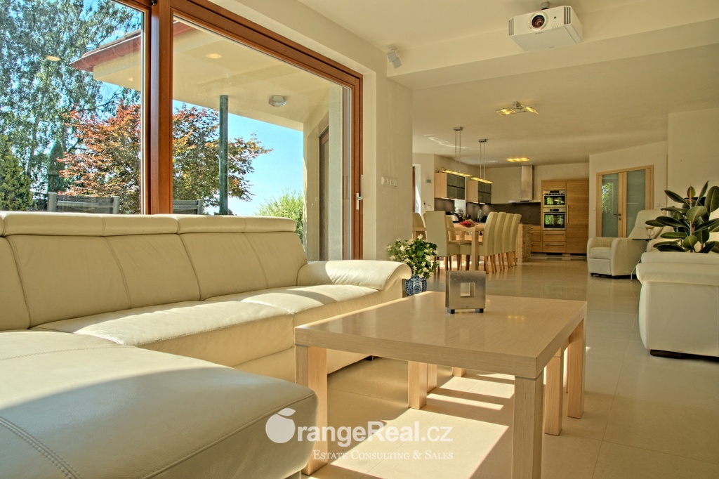 Výhradně nabízíme k prodeji luxusní rodinný dům - Tehov u Říčan, dispozičně 7+kk, o celkové obytné ploše 236m2 + garáž 71m2 + 2x terasa 46m2 a 120m2 + finská a bio-sauna s vířivkou, na pozemku o celkové rozloze 1.022m2. Dům je situován v okrajové části obce Tehov u Říčan, jenž se rozkládá v krásné přírodě, mezi hustými neporušenými lesy. Rodinný dům byl vystavěn v roce 2001 a v roce 2013 byl rekonstrukcí rozšířen a kompletně modernizován. Svému majiteli zajistí komfortní bydlení se splněním všech nároků současných trendů, v kombinaci pobytu v klidu krásné přírody v okolí domu - pečlivě udržovaná zahrada se vzrostlými stromy, okrasnými dřevinami, automatickou závlahou, koupacím jezírkem, letní kuchyní a dále terasami s posezením. Rodinný dům, architektonicky citlivě zasazen do terénního profilu, je koncipován kaskádovitě, v úrovni příjezdu je umístěna prostorově velkorysá garáž s krytým stáním a přímým vstupem do domu, obytná plocha, čítající dvě nadzemní patra byla vybudována v další úrovni terénu, díky tomu skýtá krásný výhled do okolní zeleně. I. NP - za vstupním zádveřím se nachází jídelní prostor, kuchyňské zázemí /kuch. linka SYKORA s vestavěnými spotřebiči AEG/ a centrální obytný prostor s krbovými kamny. Z jídelny a obývacího prostoru přímé výstupy na terasu a do zahradní části, která zaručuje ničím nerušený pobyt díky vzrostlým stromům. V tomto podlaží dále tři obytné místnosti a dvě koupelny s toaletou. II. NP – dva dětské pokoje, koupelna s toaletou, ložnice s vestavěnou skříní, ze všech místností přímý vstup na terasu. Dřevěná Eurookna chrání předokenní rolety na ele. pohon, podlahy kombinace lamina a keramické dlažby. Stavebním prvkem domu Porotherm, střecha KM Beta. Vytápění a ohřev teplé vody zajištuje plynový kotel s rozvody do radiátorů, podlahového vytápění a otopných žebříků v koupelnách. Veškeré inženýrské sítě jsou zavedeny do domu. V obci MŠ, ZŠ, obchod, kulturní zařízení. Další občanská vybavenost v obci Stránčice 3km, Říčany 6km, Praha 17km. Dopravní obslužnost MHD, ČD ve Stránčicích, Říčanech. Doplňující informace u obchodníka.