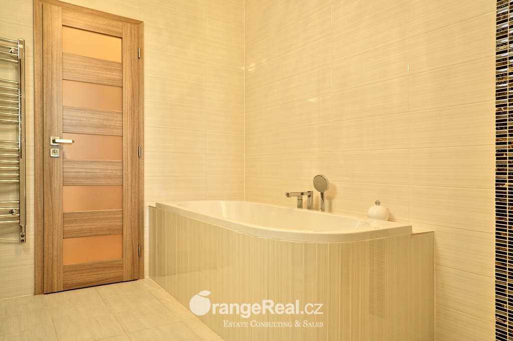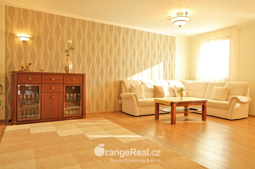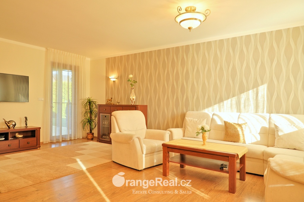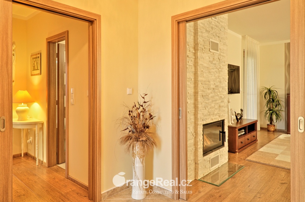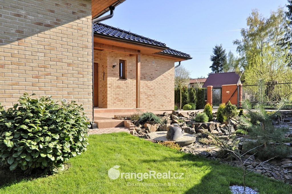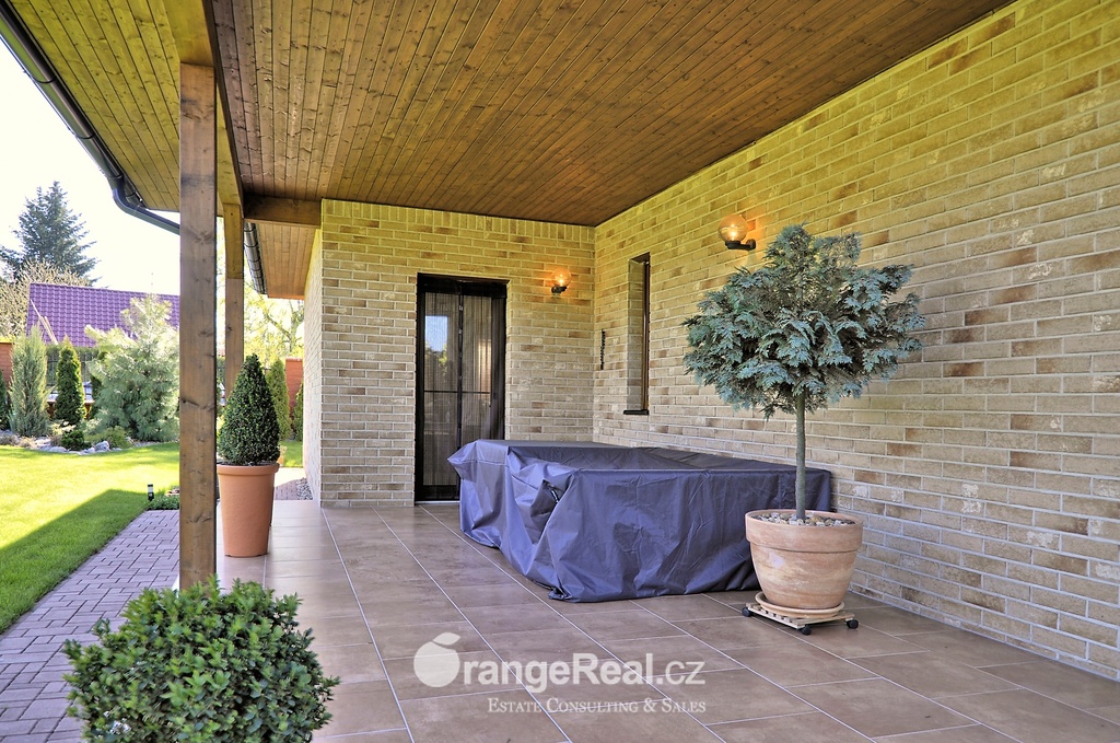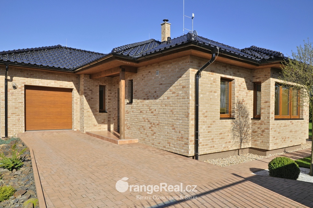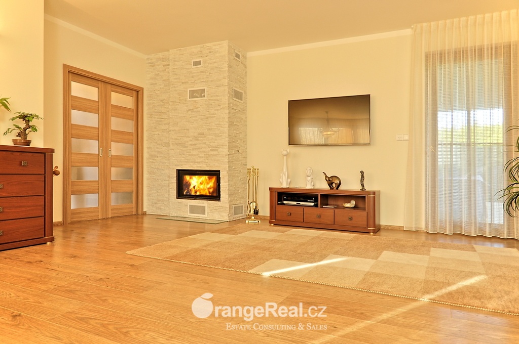 Výhradně nabízíme k prodeji luxusní novostavbu - rodinný dům v lokalitě Tehovec, Praha - Východ, z roku 2013, dispozičně 3+1, o obytné ploše 170m2 + garáž a terasa. Dům disponuje 3 obynými místnostmi, kuchyní, koupelnou, technickým zázemím, šatnou, terasou a garáží. Ze vstupní haly je přístup do šatny, na toaletu a do centrální obývací místnosti s krbem, propojené s kuchyňským zázemím a jídelním prostorem. Z centrální místnosti můžeme vstoupit na prostornou krytou terasu, orientovanou na jihovýchod. Ze vstupní haly dále pokračujeme do oddělené chodby, kde se nachází vstup do dalších 2 pokojů, koupelny s toaletou a technické místnosti s umístěnou pračkou, sušičkou a bojlerem na ohřev TUV. Teplo zajišťuje ele podlahové topení a sekundárně krbová vložka. Přes technickou místnost je přímý vstup do garáže. Při výstavbě byl kladem maximální důraz na kvalitu použitých materilálů. Dům byl zařízen s vybraným vkusem a citem pro detail. Podlahy plovoucí a dlažba. Okna plast 5 komor, trojskla. Okna osazena vnitřními žaluziemi a venkovními ele roletami. Stavebním materiálem jsou dřevopanely zatepleny 15cm polystyrenem. Celý dům je obložen cihlovými pásky Klinger. Složení zajišťuje maximální izolační vlastnosti. Náklad na výtápění domu a ohřev teplé vody =2.700,-Kč/měs. Pečlivě udržovaná okrasná zahrada, o rozloze 589m2, disponuje vlastním 30m vrtem zajišťujícím užitkovou vodu, která je rozvedena i v domě. Velmi nízké náklady na provoz domu. V obci lékař, MŠ, další občanská vybavenost 2km - Mukařov, 4km - Říčany. Výborné spojení do Prahy. Doplňující informace u obchodníka společnosti. Doporučujeme navštívit virtuální prohlídku na webových stránkách naší společnosti.