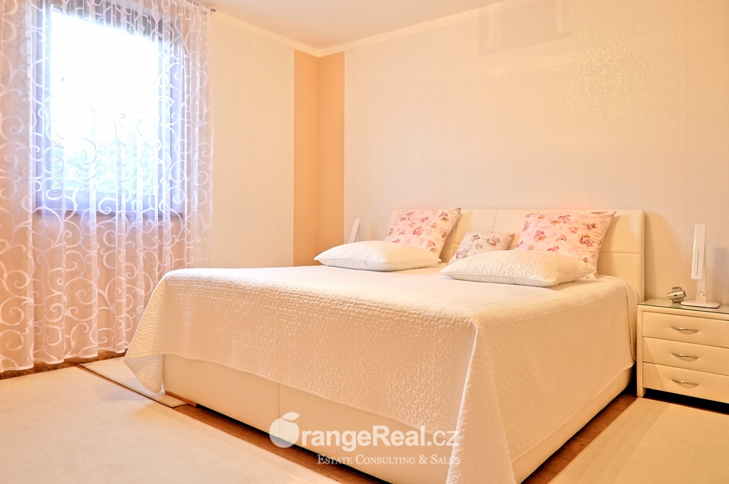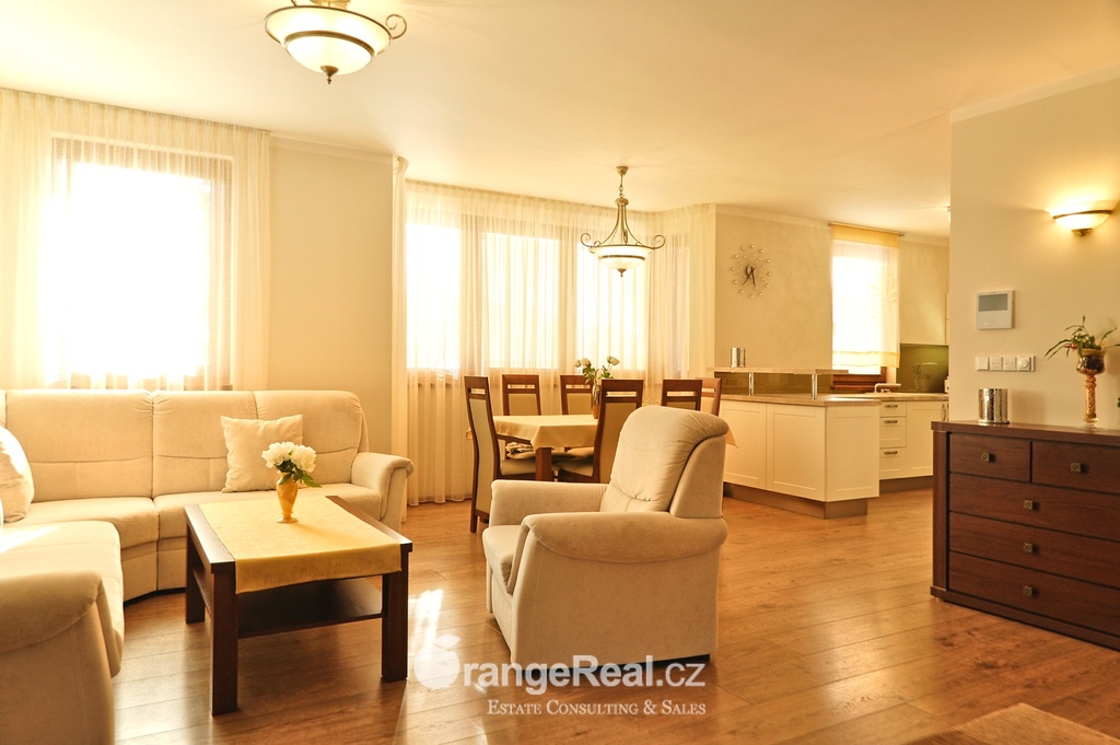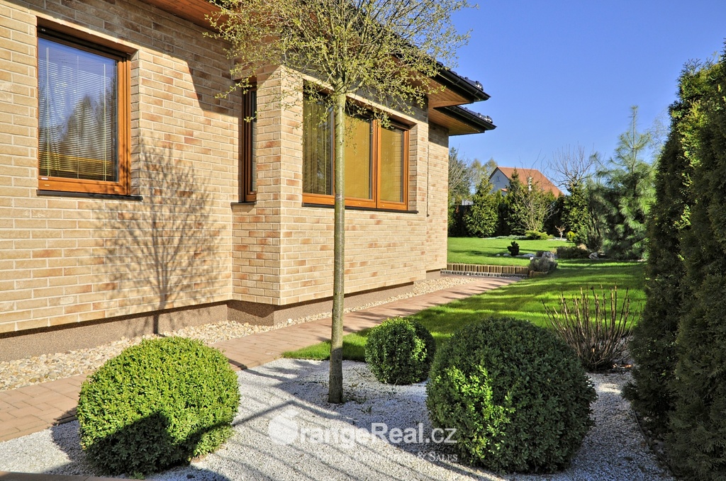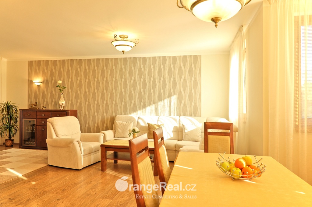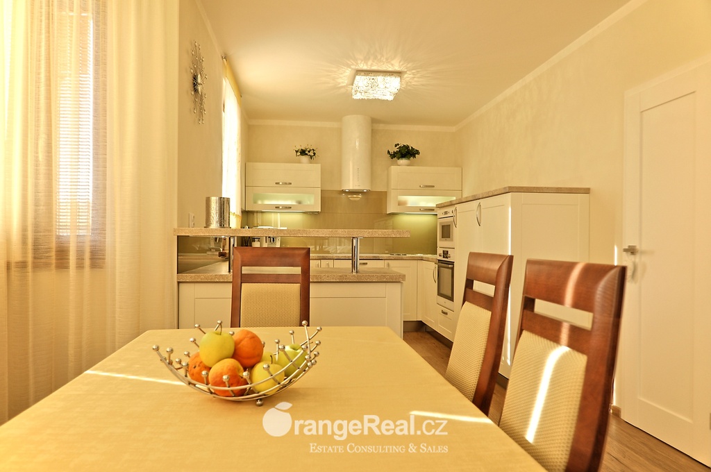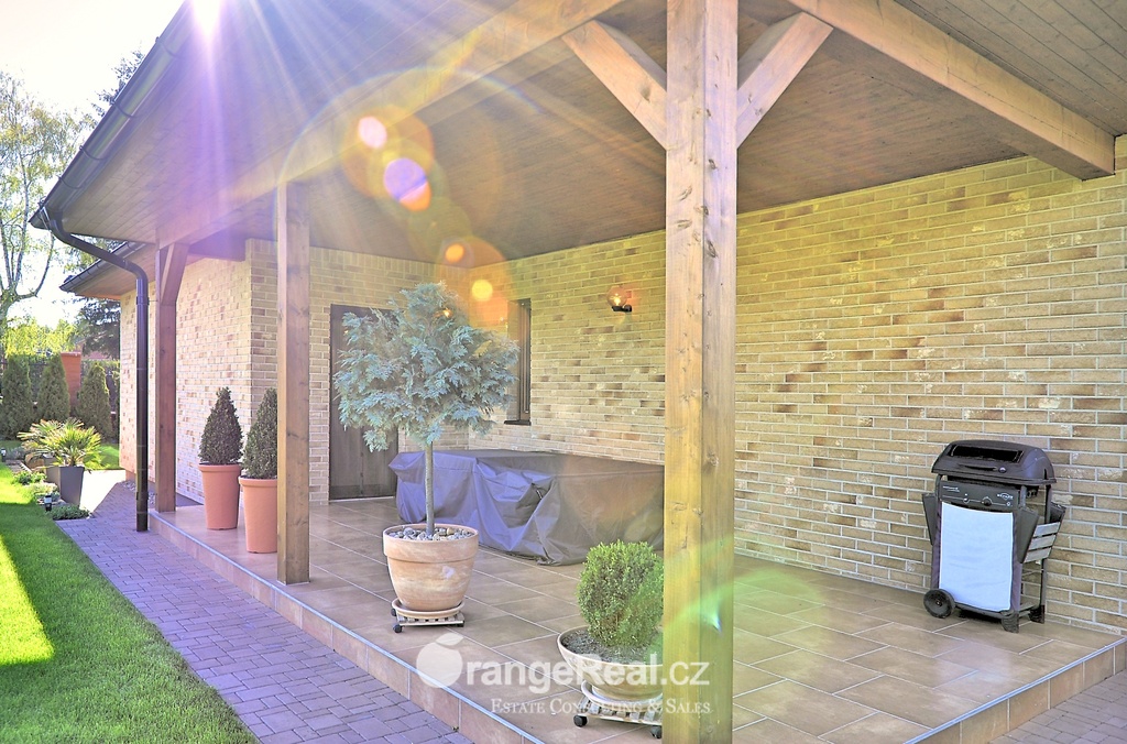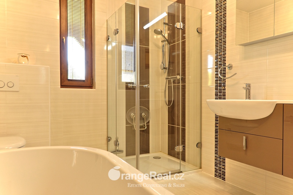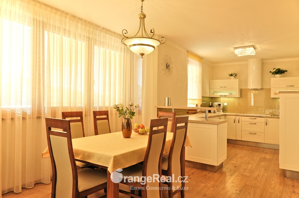 Výhradně nabízíme k prodeji luxusní novostavbu - rodinný dům v lokalitě Tehovec, Praha - Východ, z roku 2013, dispozičně 3+1, o obytné ploše 170m2 + garáž a terasa. Dům disponuje 3 obynými místnostmi, kuchyní, koupelnou, technickým zázemím, šatnou, terasou a garáží. Ze vstupní haly je přístup do šatny, na toaletu a do centrální obývací místnosti s krbem, propojené s kuchyňským zázemím a jídelním prostorem. Z centrální místnosti můžeme vstoupit na prostornou krytou terasu, orientovanou na jihovýchod. Ze vstupní haly dále pokračujeme do oddělené chodby, kde se nachází vstup do dalších 2 pokojů, koupelny s toaletou a technické místnosti s umístěnou pračkou, sušičkou a bojlerem na ohřev TUV. Teplo zajišťuje ele podlahové topení a sekundárně krbová vložka. Přes technickou místnost je přímý vstup do garáže. Při výstavbě byl kladem maximální důraz na kvalitu použitých materilálů. Dům byl zařízen s vybraným vkusem a citem pro detail. Podlahy plovoucí a dlažba. Okna plast 5 komor, trojskla. Okna osazena vnitřními žaluziemi a venkovními ele roletami. Stavebním materiálem jsou dřevopanely zatepleny 15cm polystyrenem. Celý dům je obložen cihlovými pásky Klinger. Složení zajišťuje maximální izolační vlastnosti. Náklad na výtápění domu a ohřev teplé vody =2.700,-Kč/měs. Pečlivě udržovaná okrasná zahrada, o rozloze 589m2, disponuje vlastním 30m vrtem zajišťujícím užitkovou vodu, která je rozvedena i v domě. Velmi nízké náklady na provoz domu. V obci lékař, MŠ, další občanská vybavenost 2km - Mukařov, 4km - Říčany. Výborné spojení do Prahy. Doplňující informace u obchodníka společnosti. Doporučujeme navštívit virtuální prohlídku na webových stránkách naší společnosti.