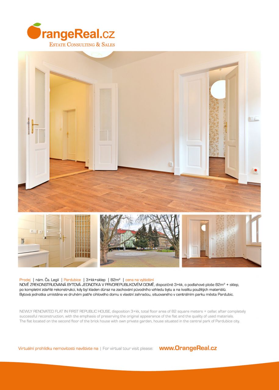 Výhradně nabízíme k prodeji kompletně zrekonstruovaný byt dispozičně 3+kk, o rozloze 79m2, ve 2.patře cihlového prvorepublikového domu, se 6 bytovými jednotkami, ve vyhledávané lokalitě Pardubice, náměstí Čs. Legií. V bytě proběhla v letošním roce velmi zdařilá kompletní rekonstrukce, kdy byl kladen důraz na zachování původního vzhledu bytu a na kvalitu použitých materiálů - nová plast. okna, vč. žaluzií, nová koupelna a samostatná toaleta, renovace dřevěných dveří, vč. obložkových zárubní, položení vysoce kvalitního lina. Byt sestává ze dvou pokojů, centrální místnosti, vstupní chodby, koupelny a toalety. K bytu přináleží sklep v I. PP domu. Za domem se rozkládá prostorná průběžně udržovaná zahrada ve vlastnictví všech členů SVJ domu, jejíž užitná hodnota při poloze v centru města, je neocenitelná. Umístění bytu ve vnitrobloku zajišťuje majitelům maximální klid a soukromí. Veškerá občanská vybavenost v místě, výborná dostupnost do všech částí města Pardubice, vlak i bus nádraží v pěší vzdálenosti. Parkování před domem na rezidenční kartu. Dům prozatím nedisponuje energetickým průkazem, v inzerci je proto uvedena třída energ. náročnosti G. Doplňující informace u obchodníka společnosti. Doporučujeme navštívit virtuální prohlídka na web stránkách naší společnosti.