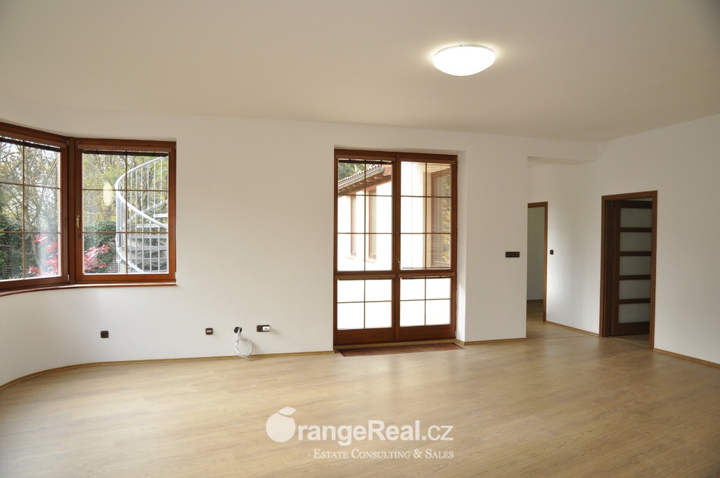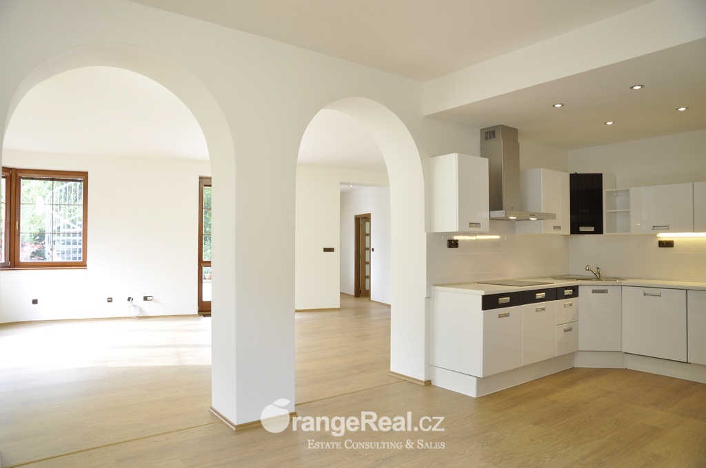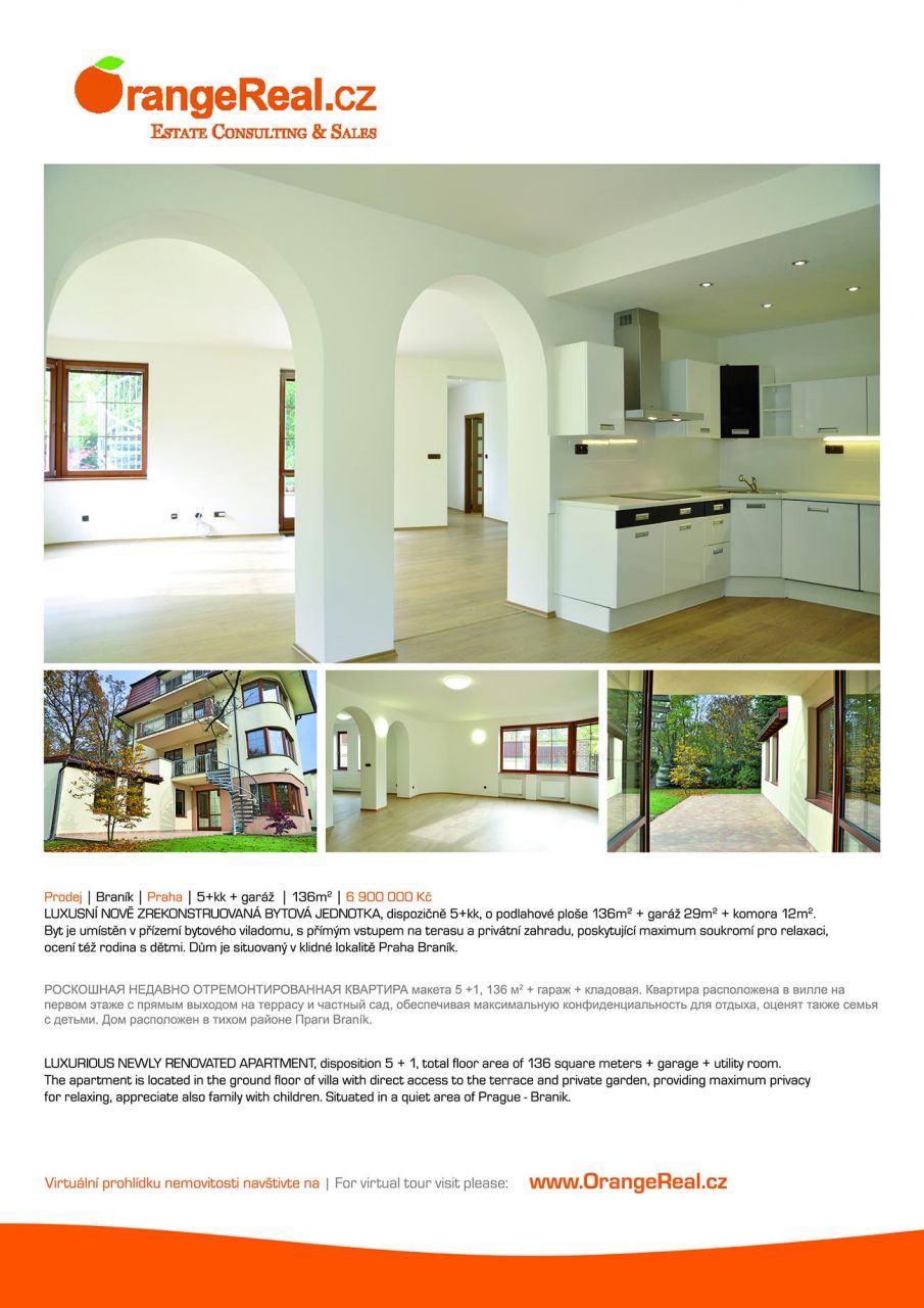 Naše společnost výhradně nabízí k prodeji luxusní, nově zrekonstruovanou bytovou jednotku, dispozičně 5+kk, o celkové podlahové ploše bytu 136m2 + garáž 29m2 + komora 12m2. Byt je umístěn v přízemí bytového viladomu z roku 2002, v prestižní lokalitě Praha 4, Braník, Jiráskova čtvrť. Ze vstupní chodby bytu je možno vstoupit do jídelny s kuchyňským koutem, dále do šatny, koupelny a samostatné toalety. Centrální část bytu tvoří obytný prostor, propojený s jídelním a kuchyňským zázemím. Z obytného prostoru se vchází na terasu 18m2 a dále je zde vstup do jedné z ložnic. Další dvě ložnice jsou odděleny chodbou. K bytu dále přináleží spoluvlastnické podíly na společných částech domu, na pozemcích souvisejících s budovou a na zahradě za domem. Při výstavbě bytové jednotky byly použity stavební materiály a zařizovací předměty nejvyšší kvality: dřevěná okna, nové dveře, plovoucí podlahy, nová kuchyňská linka, včetně spotřebičů. Vytápění bytu a ohřev teplé vody zajišťuje vlastní plynový kotel. Pořízením této bytové jednotky si zajistíte bydlení v novém, s přímým výstupem do udržované zahrady. Dům je zasazen do bujné zeleně Branického lesa, zahrada je obehnána zděným plotem. Bytový viladům skýtá maximum soukromí a klidu, přičemž se nachází nedaleko přímého centra Prahy. Veškerá občanská vybavenost v pěší, či menší dojezdové vzdálenosti – obchodní a sportovní centra, ZŠ, MŠ, poliklinika. Stanice MHD se nachází nedaleko domu. Doplňující informace u obchodníka společnosti. Doporučujeme navštívit virtuální prohlídku na webových stránkách naší společnosti.