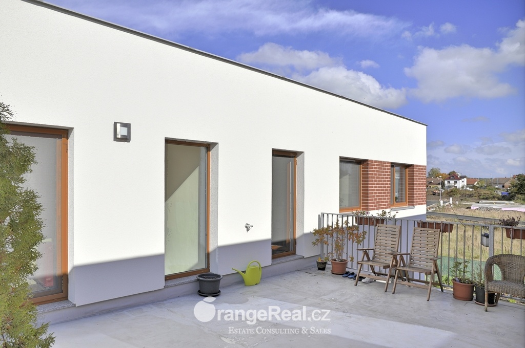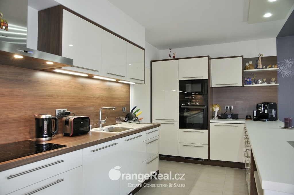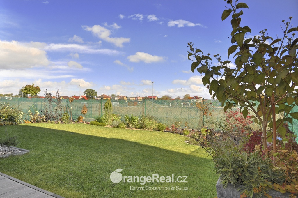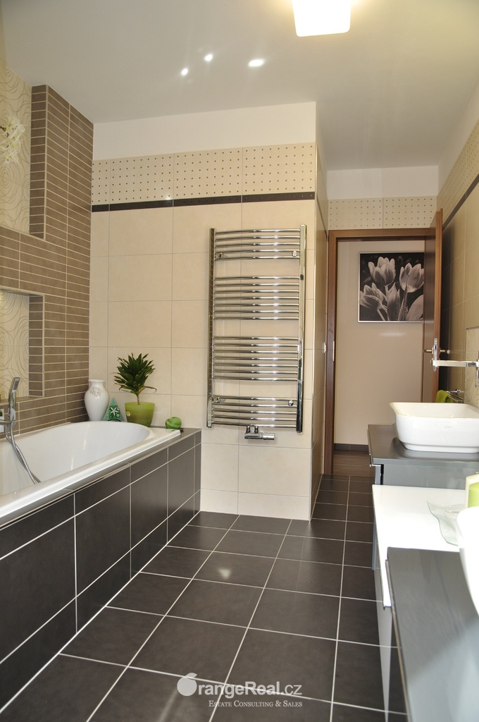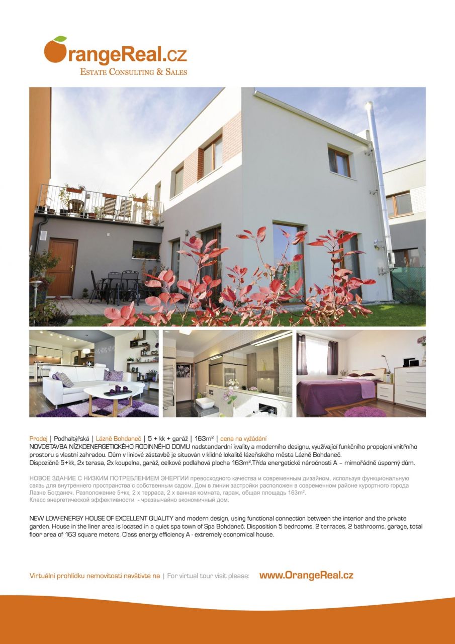 Výhradně nabízíme k prodeji novostavbu nízkoenergetického rodinného domu v liniové zástavbě, ve vyhledávané lokalitě Lázně Bohdaneč. Dům o dispozici 5+kk+dvě terasy+garáž a obytné ploše 163m2, je umístěn na pozemku o rozloze 282m2. Zastavěná plocha 114m2. V I. NP se nachází vstupní chodba, koupelna s toaletou, ložnice a hlavní, prostorově nadstandardní, obytný prostor spojený s kuchyňským a jídelním zázemím a s výstupem na zahradní terasu a zahradu. Za kuchyní je skladová místnost, která zvyšuje úložné kapacity domu. Dále v I. NP nalezneme technickou místnost, kde je umístěn el. kotel a bojler na ohřev vody a vstup do garáže. Ve II. NP se nachází 3 prostorné místnosti, koupelna /sprch. kout, vana a 2x umyvadlo/, samostatná toaleta a výstup na terasu, orientovanou na jih. RD je vystavěn systémem Liapor, zateplení domu včetně střešní izolace provedeno v rozsahu nízkoenergetické stavby – tř. energ. náročnosti A, se ztrátou 47 kWh/m2/rok. Nízké náklady na vytápění podporuje také krbová vložka umístěna v obývacím prostoru. Vytápění RD je zajištěno rozvody podlahového vytápění v celém domě. Na návrzích interiérů a zahradních úpravách se podílel architekt. Veškeré zařizovací předměty jsou v nadstandardní kvalitě. Kuchyně Sykora, spotřebiče Siemens. Dřevěné schody, dveře, zárubně, vestavěné skříně. V RD rozveden centrální vysavač. Podlahové krytiny - plovoucí podlahy a dlažba. Na zahradě instalováno automatické zavlažování. Odtah krbu zajištěn nerezovým venkovním komínem. Byla provedena příprava k instalaci slunečních kolektorů na střeše RD. Pořízením tohoto domu si zajistíte plnohodnotné bydlení v klidné lokalitě obklopené parkovou zelení, která nabízí komfort lázeňského města. V okolí všestranné sportovní vyžití - cyklistika, golf, plavání, rybolov. Výborná dopravní dostupnost Hradec Králové 18km, Pardubice 8km, dálnice Praha 8min. exit. Veškerá občanská vybavenost v místě – škola, školka, úřady, lékaři, obchody. Veškeré doplňující informace o této nevšední nemovitosti, včetně možností financování, u obchodníka společnosti na vyžádání. Doporučujeme osobní návštěvu této nemovitosti.