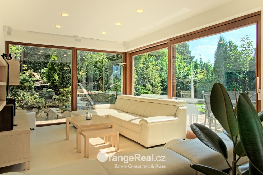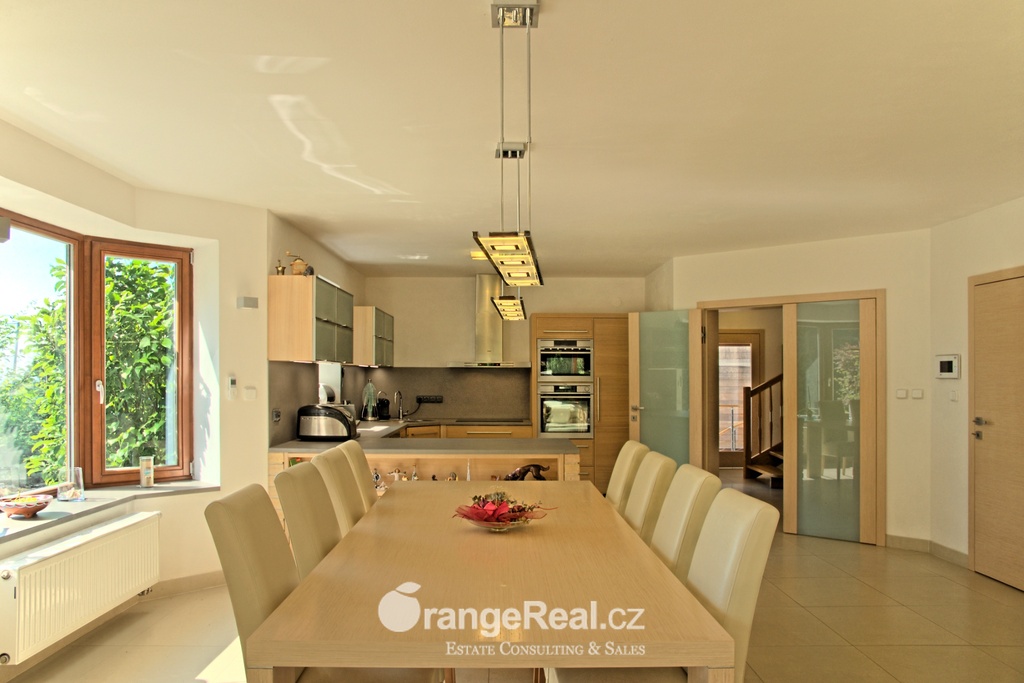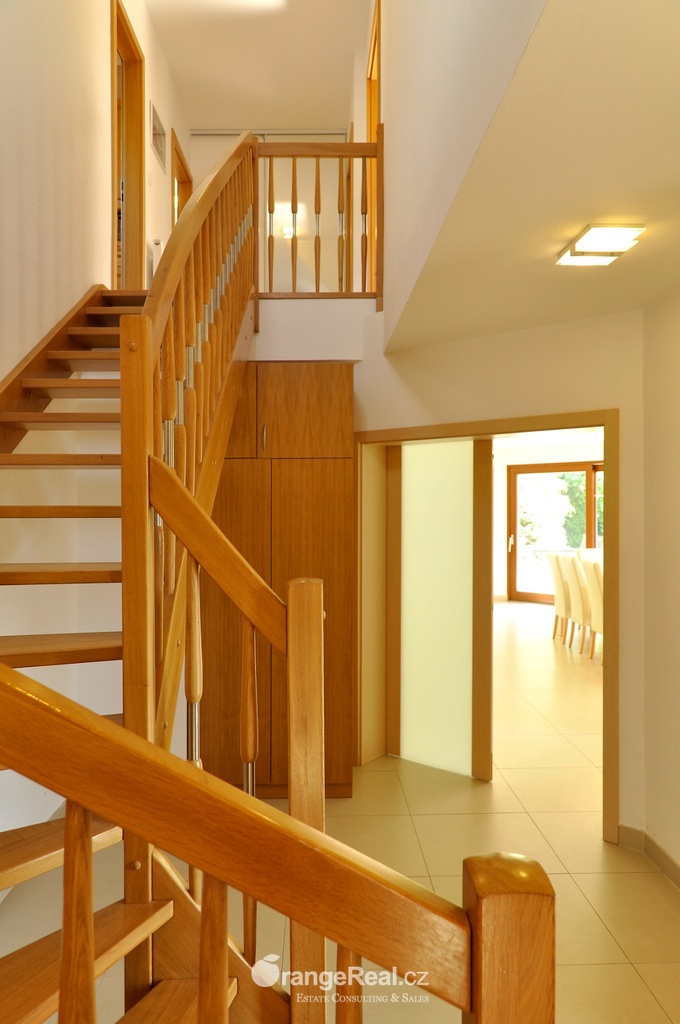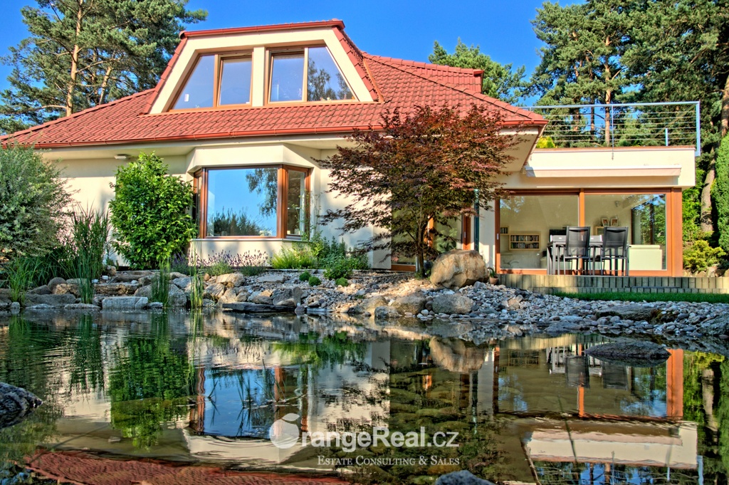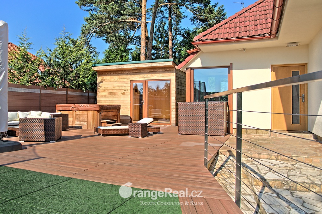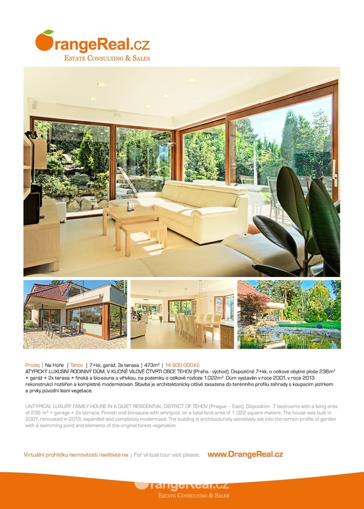 Výhradně nabízíme k prodeji luxusní rodinný dům - Tehov u Říčan, dispozičně 7+kk, o celkové obytné ploše 236m2 + garáž 71m2 + 2x terasa 46m2 a 120m2 + finská a bio-sauna s vířivkou, na pozemku o celkové rozloze 1.022m2. Dům je situován v okrajové části obce Tehov u Říčan, jenž se rozkládá v krásné přírodě, mezi hustými neporušenými lesy. Rodinný dům byl vystavěn v roce 2001 a v roce 2013 byl rekonstrukcí rozšířen a kompletně modernizován. Svému majiteli zajistí komfortní bydlení se splněním všech nároků současných trendů, v kombinaci pobytu v klidu krásné přírody v okolí domu - pečlivě udržovaná zahrada se vzrostlými stromy, okrasnými dřevinami, automatickou závlahou, koupacím jezírkem, letní kuchyní a dále terasami s posezením. Rodinný dům, architektonicky citlivě zasazen do terénního profilu, je koncipován kaskádovitě, v úrovni příjezdu je umístěna prostorově velkorysá garáž s krytým stáním a přímým vstupem do domu, obytná plocha, čítající dvě nadzemní patra byla vybudována v další úrovni terénu, díky tomu skýtá krásný výhled do okolní zeleně. I. NP - za vstupním zádveřím se nachází jídelní prostor, kuchyňské zázemí /kuch. linka SYKORA s vestavěnými spotřebiči AEG/ a centrální obytný prostor s krbovými kamny. Z jídelny a obývacího prostoru přímé výstupy na terasu a do zahradní části, která zaručuje ničím nerušený pobyt díky vzrostlým stromům. V tomto podlaží dále tři obytné místnosti a dvě koupelny s toaletou. II. NP – dva dětské pokoje, koupelna s toaletou, ložnice s vestavěnou skříní, ze všech místností přímý vstup na terasu. Dřevěná Eurookna chrání předokenní rolety na ele. pohon, podlahy kombinace lamina a keramické dlažby. Stavebním prvkem domu Porotherm, střecha KM Beta. Vytápění a ohřev teplé vody zajištuje plynový kotel s rozvody do radiátorů, podlahového vytápění a otopných žebříků v koupelnách. Veškeré inženýrské sítě jsou zavedeny do domu. V obci MŠ, ZŠ, obchod, kulturní zařízení. Další občanská vybavenost v obci Stránčice 3km, Říčany 6km, Praha 17km. Dopravní obslužnost MHD, ČD ve Stránčicích, Říčanech. Doplňující informace u obchodníka.